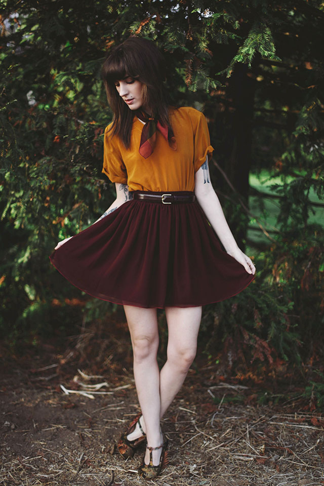 Oh how I love the golden glow of Autumn! Now that the days are super short and the sun is ready to set at 5pm, I'm having to take full advantage of my Sunday's off. These photos were taken on a quiet Sunday evening at our favorite park right at that magical golden hour when my bangs were really in need of a serious trim. This blouse is one I thrifted a couple years ago and it's found its way into some of my favorite Fall looks ever since (and will probably find its way into a few more this season) and this Port colored American Apparel skirt is an essential, and for Winter, I'll just switch this mini out for the maxi version; I think I actually own every single style they make in this color, it's my favorite!